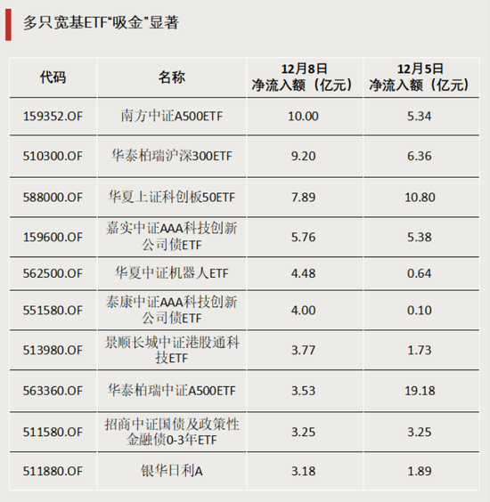 12月8日,全市场净流入额最高的ETF是南方中证A500ETF,达10亿元;12月5日,全市场净流入额最高的ETF是华泰柏瑞中证A500ETF,达19.18亿元。