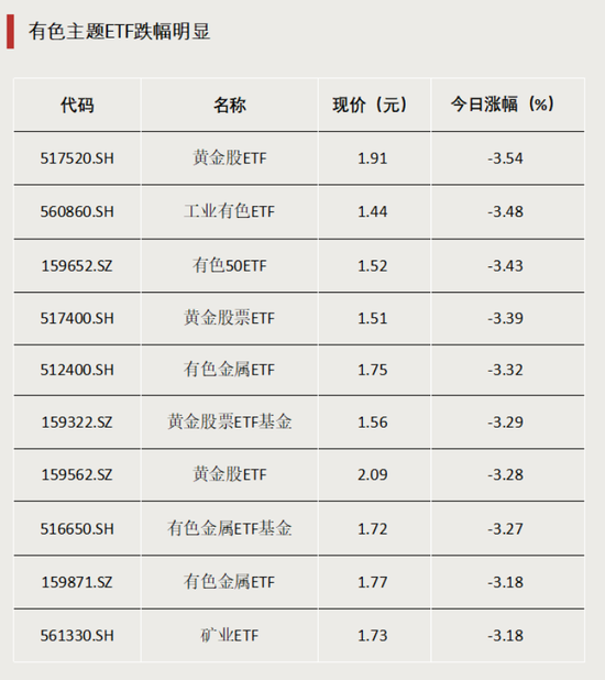 12月9日,有色、黄金等板块表现疲软,多只相关主题ETF跌超3%。